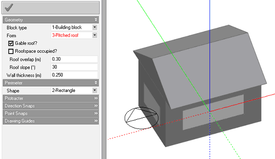 This page describes DesignBuilder pitched roof geometry generation with reference an example roof created by drawing a rectangular perimeter with an offset of 0.3m and an external wall thickness of 0.25m: