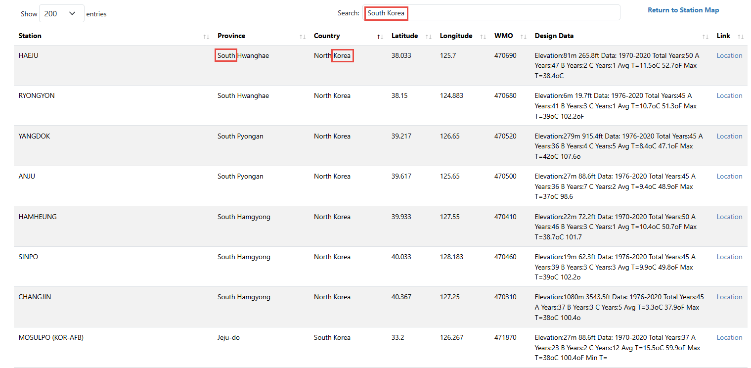 On the other hand, if you type in "South Korea", but this time without the quotes, the search results include all stations with both "South" and "Korea" in one of the columns. This results in some stations in North Korea with "South" in the Provence name being included: