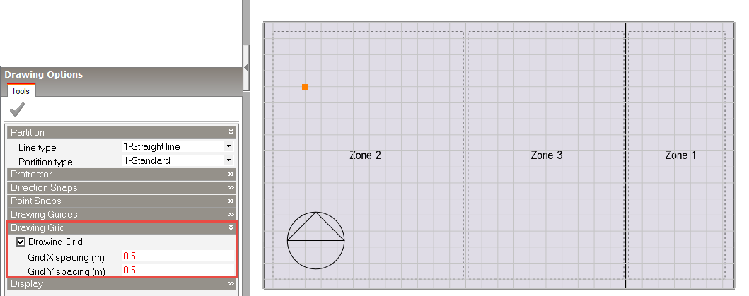 The Drawing Grid Drawing option provides a different, more visual way to obtain snap points based on a grid when drawing new objects at Block and Surface levels: