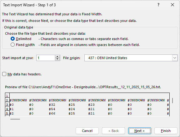 Note: This process doesn't recover the names of each column, however the natural column order is retained, so it should generally be possible to identify the column headings by cross-referencing with the results grid in DesignBuilder.