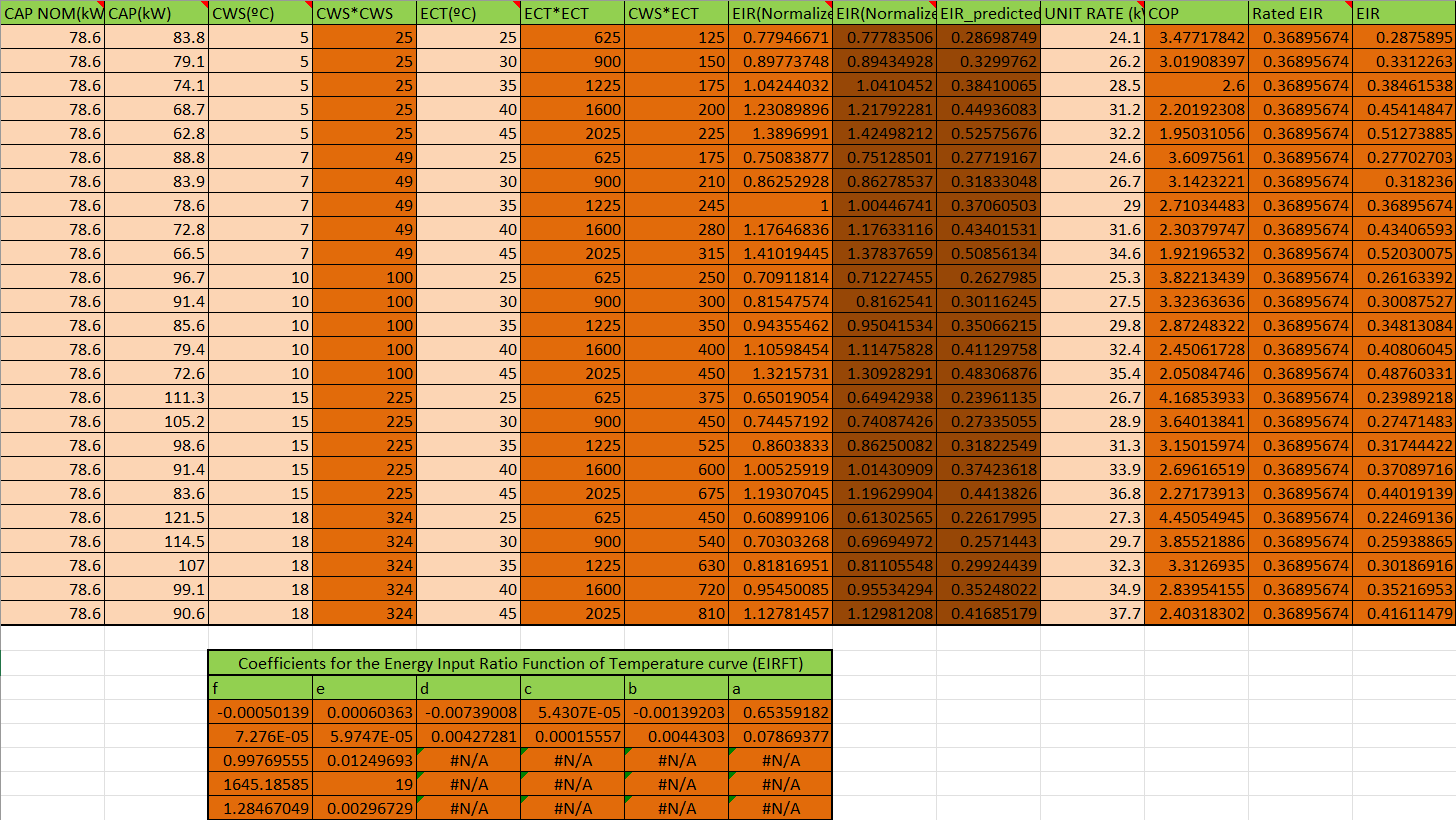 The spreadsheet calculates the performance metrics: EIR(Normalized), EIR(Normalized EIR_predicted), COP, and EIR.