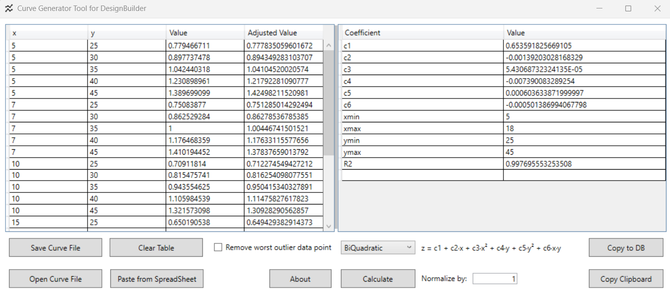 Click the Copy to DB button to prepare for pasting the coefficients to the DesignBuilder Curve Editor, or Save Curve File for later entry, or Copy to Clipboard to paste the coefficients to a spreadsheet.