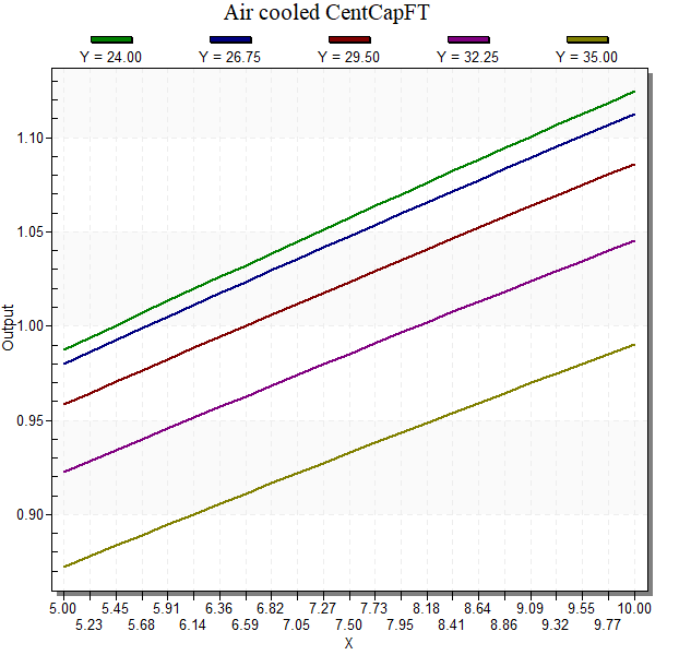 Each coloured line shows the multiplier (e.g. EIR multiplier) at different leaving water temperatures while holding the entering condenser water temperature constant. For example, the green line (Y=25°C) shows how EIR varies as leaving chilled water temperature changes from 5°C to 18°C when the condenser temperature is at 25°C.