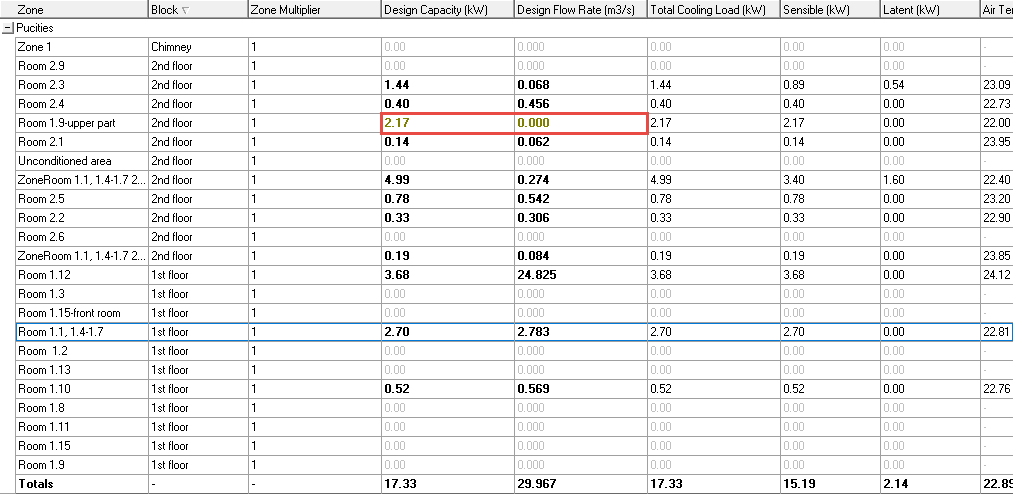 In some cases, DesignBuilder may not be able to calculate a supply air flow rate, and in these cases, results may be displayed in brown bold text. The screenshot below illustrates.