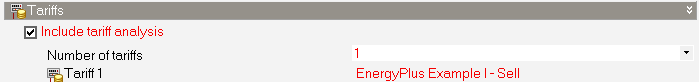 DesignBuilder provides access to EnergyPlus' tariff analysis capabilities by allowing you to define one or more tariffs using the Tariffs dialog. To include a tariff analysis in your simulation, start by checking the Include tariff analysis checkbox. This allows you to set the number of tariffs to be defined and to assign a Tariff component to each one.