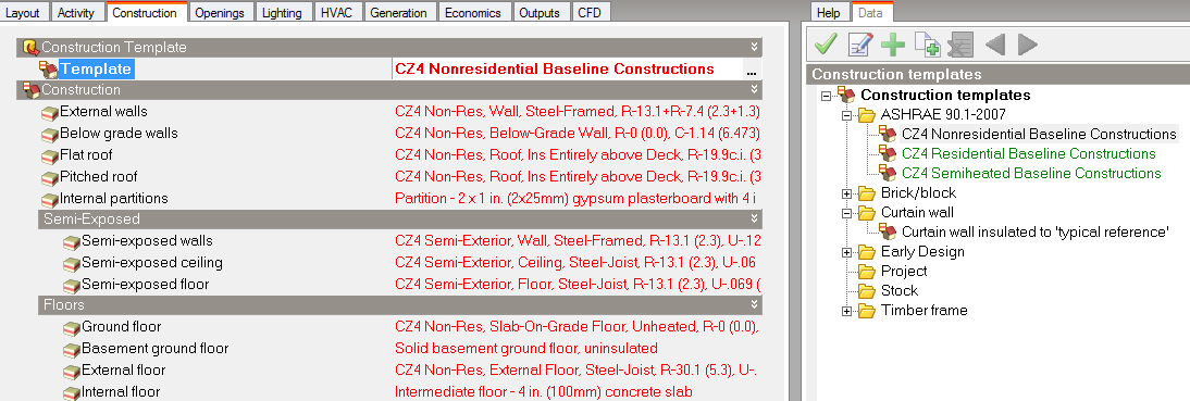 If instead you used the External measurements template for example you would find that the baseline building surface areas, floor area and zone volumes would be different after loading the baseline constructions because these generally have a different thickness to those selected for the proposed building.