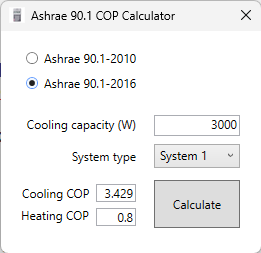 From the ASHRAE 90.1 Standard, all HVAC equipment in the baseline building design shall be modelled at the minimum efficiency levels, both part load and full load. The efficiency rating that includes the supply fan energy shall be adjusted to remove the supply fan energy so that supply fan energy can be modelled separately. To help meet this requirement, for baseline systems that use DX cooling coils, i.e., systems #1 through #6, the COP input can be calculated using a simple ASHRAE COP calculation tool.