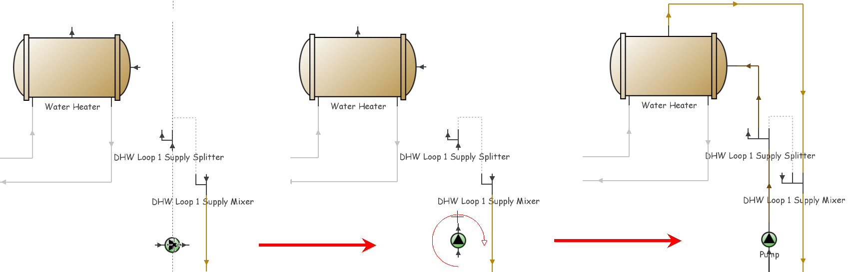 Pumps can only be included in the supply sub-loops of plant and condenser loops. EnergyPlus requires that the pump must be the first component in the sub-loop. Consequently, a pump must be connected directly to the sub-loop inlet node. Only one pump can be added to each plant/condenser supply sub-loop and so the tool will only appear on the toolbar at the plant/condenser sub-loop level if you delete the existing pump in order to change its orientation.