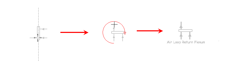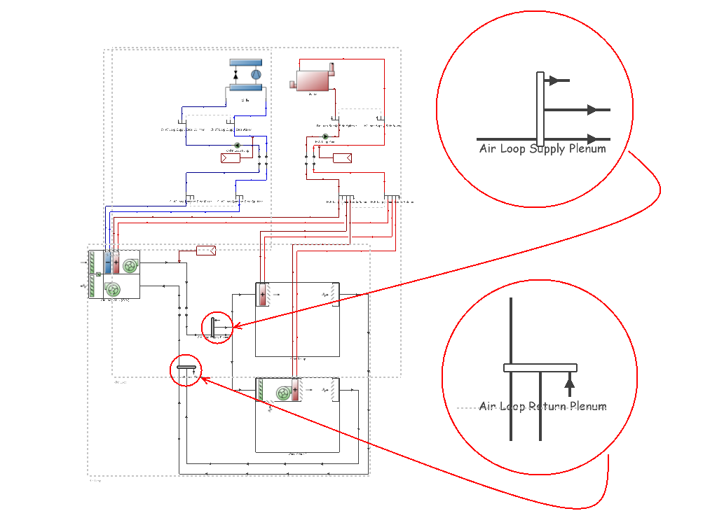When an air loop is first placed, a splitter and mixer component is automatically included on the supply and return sides respectively. The normal way to place a supply plenum is to first delete the original splitter component and replace it with a supply plenum component. Likewise to include a return plenum, first delete the original mixer component and replace it with a return plenum component.