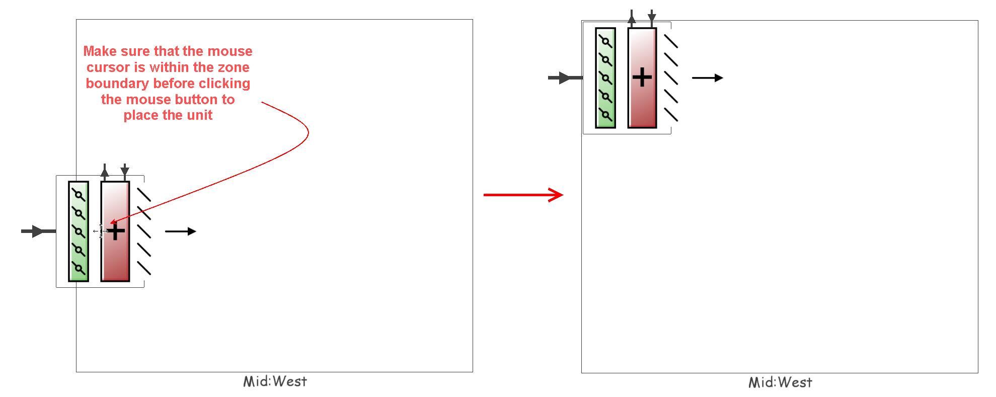Zone air distribution units are placed at the HVAC zone level. To place an ADU, navigate to the HVAC zone, click on the Add air distribution unit tool and then select the required unit from the drop-list. Then, making sure that the cursor is inside the boundary of the zone, left click with the mouse to place the ADU. The ADU will be automatically positioned at the top left of the zone: