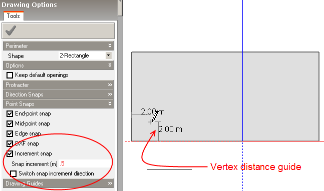 5. Next type in the window width followed by a space followed by the window height. Again the coordinates you type in are shown in the Drawing Options panel. In the example below a window is being defined having width 2m and height 1m.