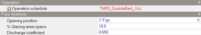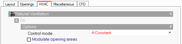 To model simple open / closed operation without modulation, you can set Control mode to 4-Constant. This control can be used to provide purge ventilation. In this case, if internal temperature > 22°C the windows are fully opened. However, please note that this operation mode does not comply with Approved Document O, its purpose is informational only. Other control modes are not valid.