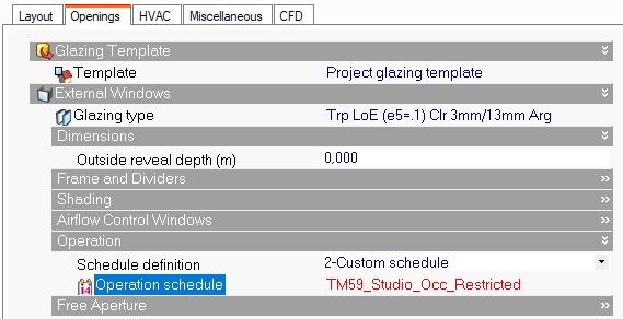 To avoid windows opening when zones are not occupied and temperature is below 22° C, pre-defined TM59 Activity templates have Natural ventilation setpoint temperature set to 22° C and use default TM59 occupancy schedule.