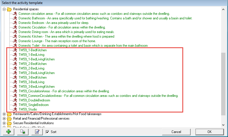 To reduce the amount of work necessary to set up the occupant and equipment gain profiles, a set of TM59 Activity templates are provided. These can be found in the “Residential spaces” activity folder.