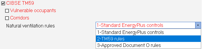 Bear in mind that the purpose of a TM59 analysis is to assess the risk of overheating and that because of the specific ventilation requirements of TM59, the same model might not generate accurate energy consumption results. To help avoid any such issues, the 1-Standard EnergyPlus controls option can be selected from the Natural ventilation rules calculation option drop list when running simulations where energy consumption is an important output.