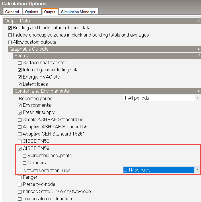 Because the default DesignBuilder natural ventilation control rules do not comply exactly with the TM59 requirements, a 2-TM59 rules natural ventilation control override option is provided to guarantee that the openings stay open even when the outdoor conditions are not favourable. The TM59 natural ventilation rules override can be applied from the “Edit calculation Options” dialog > “Graphable outputs” > “Comfort and Environmental” > “CIBSE TM59” > “Natural ventilation rules”. See screenshot below.
