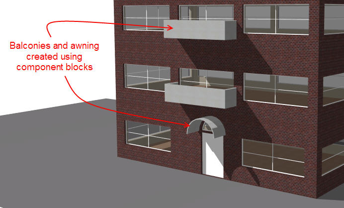 Sometimes it can be useful to create structures such as pillars, shading obstructions and balconies which do not contain zones. Standard component blocks can be used for modelling such structures as they are treated simply as shading/reflection surfaces in simulations without any zones.