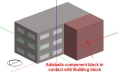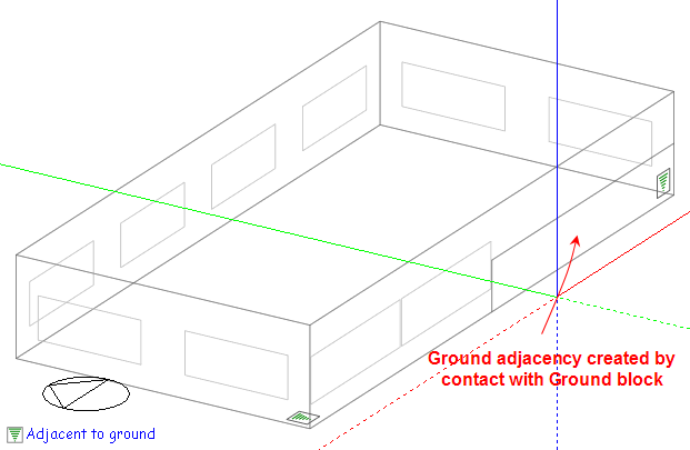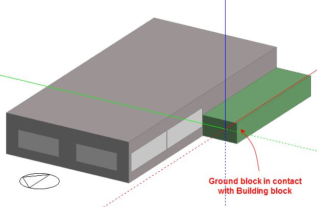 Ground component blocks can be used as a convenient way to set the adjacency of any touching building block surfaces as being 'adjacent to ground'. In the model below the Ground block (shown in green) has been positioned in contact with the building block to create a ground adjacency in the part of the Building block surface in contact with the Ground block.