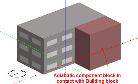 Adiabatic component blocks can be used as a convenient way to set the adjacency of any touching building block surfaces to 'adiabatic'. Adiabatic surfaces do not transfer heat beyond their outer surface and are often used for modelling boundaries with other spaces that can be considered to be at roughly the same temperature as the zone. In the model below the Adiabatic block (shown in red) has been positioned in contact with half of the South facade of the building to model the effect of an adjacent building which does not form part of the DesignBuilder model. The touching adiabatic component block creates an adiabatic adjacency in the part of the Building block surface in contact with the Adiabatic block.