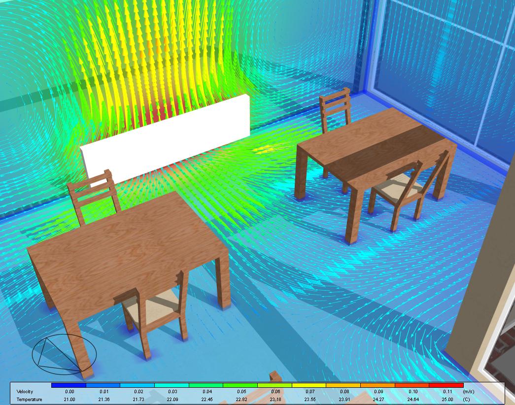 CFD when applied to buildings can provide the designer with information on probable air velocities, pressures and temperatures that will occur at any point through a predefined air volume in and around building spaces. Boundary conditions are specified which may include the effects of climate, internal heat gains and HVAC systems. DesignBuilder CFD can be used for both external and internal analyses.