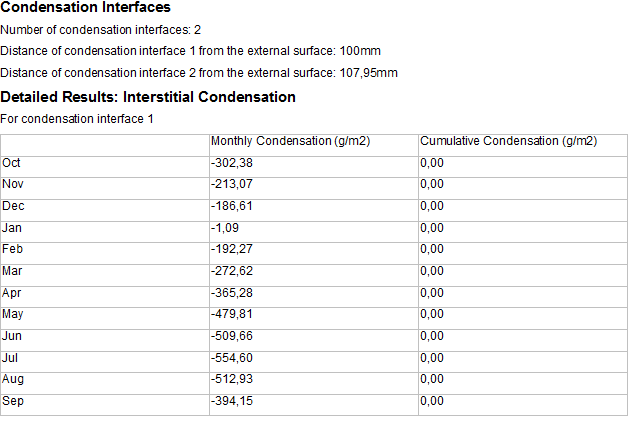 If you would like to view details of the monthly and cumulative condensation build up for each interface with condensation then check this option. In this case, if condensation is present you will see output similar to:
