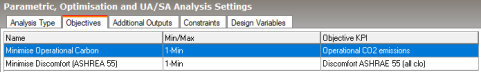 2. Go to the Objectives tab and add 2 new objectives to minimise Operational CO2 Emissions and Discomfort ASHRAE 55 (all clo). You can either edit the existing objectives or first delete those and create 2 new objectives.