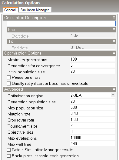 Click on the Simulation tab and press update to run a base annual simulation as a necessary step before running the optimisation. Before pressing OK, You should make the following settings: