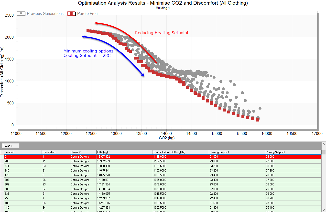 The graph shows how carbon emissions tend to be higher for more comfortable optimal solutions, i.e. that there is a "tension" between discomfort and heating and cooling energy use. Depending on how we prioritise occupant comfort over energy use / environmental impact there is a range of optimal heating and cooling setpoint temperatures.