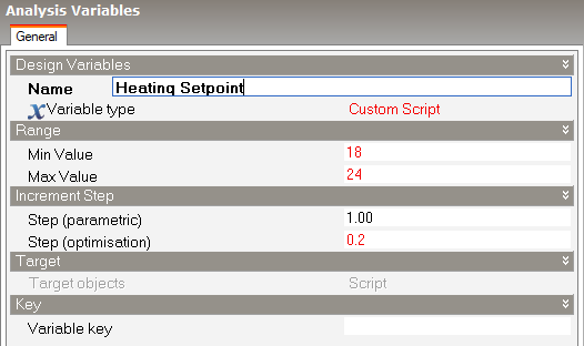 Note: The logic used to modify the setpoint temperature is applied in a simple way in this tutorial to illustrate how to use Custom script variables to make basic changes to the model. Actually, you could have reproduced exactly the same analysis without writing scripts using the built-in Heating setpoint temperature and Cooling setpoint temperature variable types! However in a real project there might be a requirement to make corresponding adjustments to natural ventilation setpoint temperatures or other changes that should respond to changes in the design variable. More complex design variables like this can easily be set up by making the necessary adjustments to a script such as the one used in this tutorial.