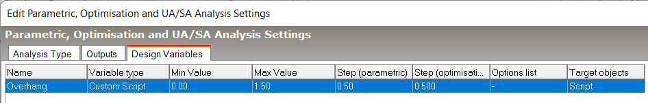 Press OK to close the Analysis variables dialog and return to the Design Variables tab of the Parametric, Optimisation and UA/SA Analysis Settings dialog, which should now look like this: