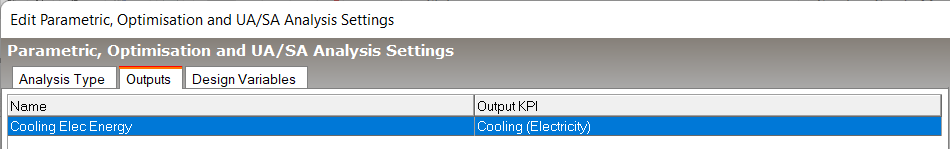 On the Analysis Outputs dialog select the Cooling Electricity Output KPI under the "Energy and Loads" category and enter the name as "Cooling Elec Energy". Press OK. The Outputs tab should now look like this: