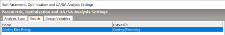 Step 3.c - On the Outputs tab add the Output results for the parametric analysis study. We will be using cooling electric energy as the KPI for this analysis:
