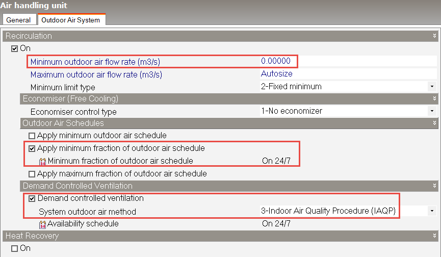 Under the Recirculation header, set Minimum outdoor air flow rate to 0.