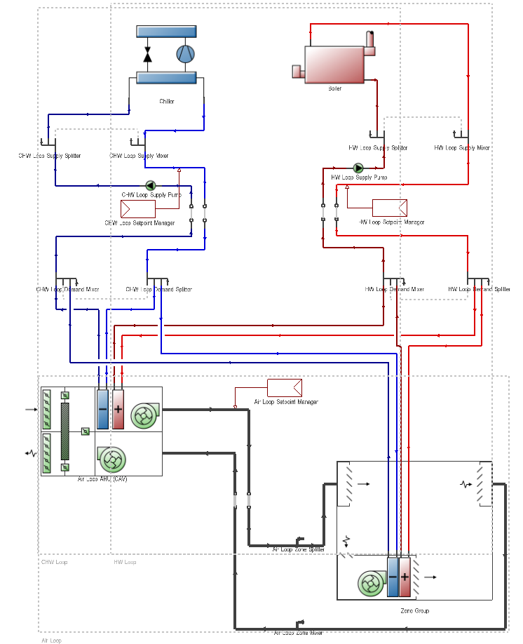 Note: the CAV No Reheat terminal unit used in this example provides pure CO2 control. Replacing this default CAV terminal with a VAV No Reheat terminal adds free cooling functionality. In this case you would have to change the AHU type to VAV to connect the VAV terminal.