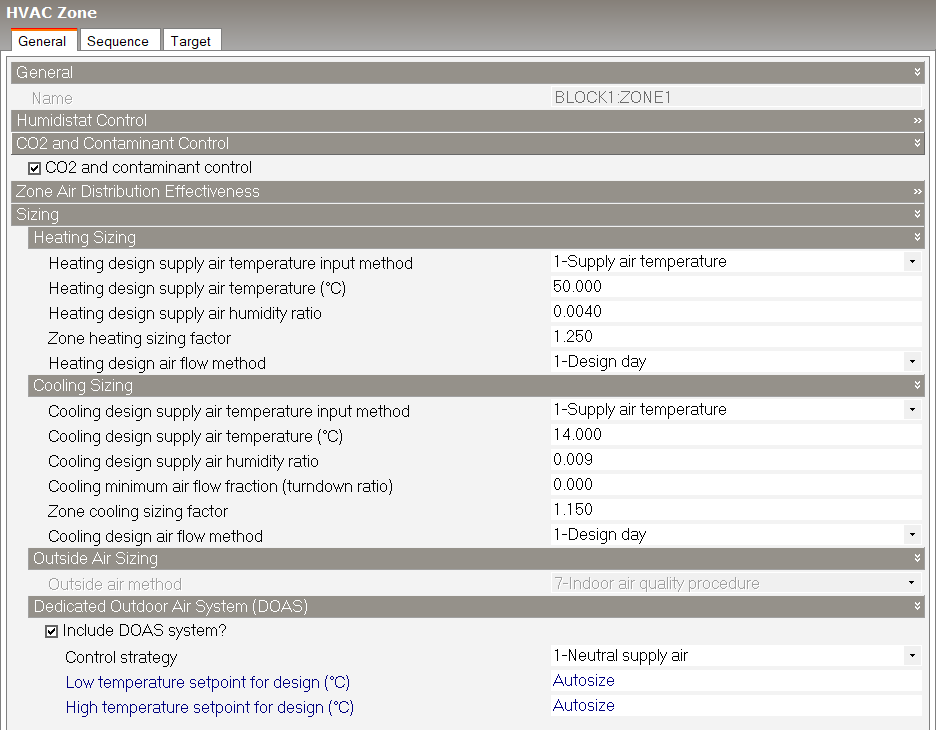 In this case, the zone Outside air definition method setting is used for sizing using fresh air per person, area and ac/h.