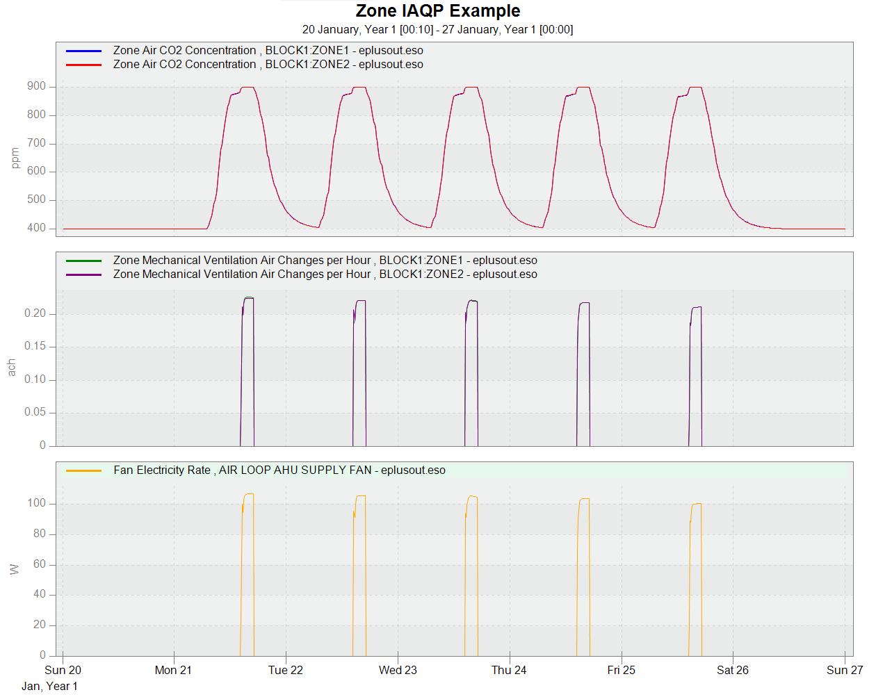 You should see results similar to those below, with zone CO2 levels controlled to 900 ppm and the fan operating constantly to achieve this.