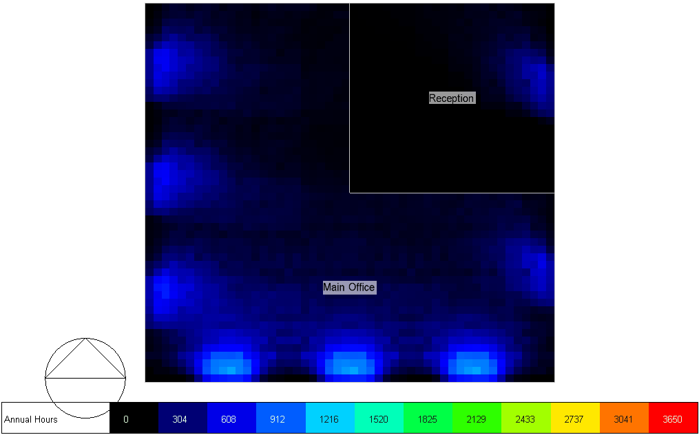 The DesignBuilder Radiance illuminance simulations provide a detailed multi-zone physics-based calculation of illumination levels on the working plane of a building using fixed static external lighting conditions and sky distributions.