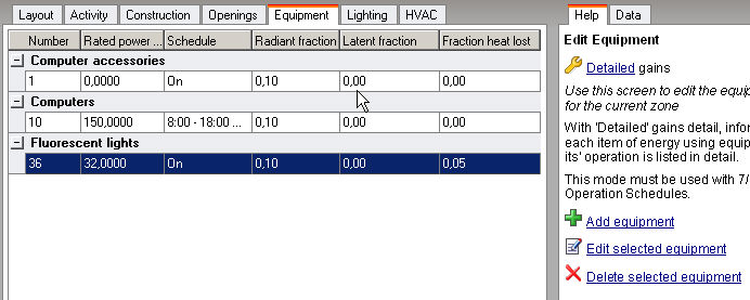 Equipment tab in model data (zone level only)