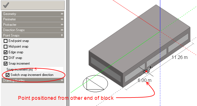 By switching the increment snap on, the point can be moved along the edge in defined increments. For example, if you wanted to start a block perimeter line at 6.0 metres from the end of the block, after switching on the increment snap, you could set the snap increment to say 0.5m and then move the mouse cursor to snap to the edge at a distance of 6.0 metres from the end-point: