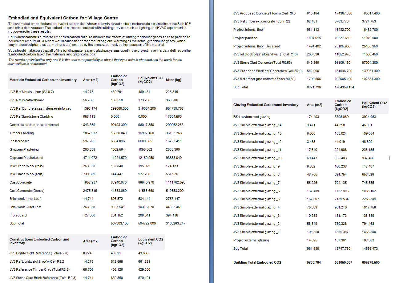 DesignBuilder provides a basic report of the embodied carbon and equivalent carbon data for the building on the LCA and Embodied Carbon tab of the Cost and Carbon screen. The carbon data covers only bulk construction, glazing and PV panel materials and excludes embodied carbon in lighting, HVAC and other building services equipment.