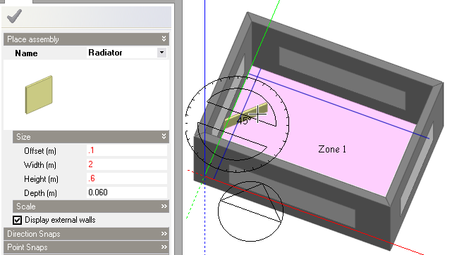 Click on the Place assembly tool and as you move the cursor back across the Edit screen, you will see that a copy of the previously created radiator assembly is attached to the cursor and the Place assembly data panel is displayed at the bottom left of the screen. Set the Offset to 0.1m to offset the base of the radiator 0.1m above the floor level, set the Width to 2.0m, the height to 0.6m and leave the Depth at 0.06m. Move the cursor to establish a snap on the construction line and click the mouse to place the radiator origin. Once the radiator has been placed, a protractor is displayed at the assembly origin enabling you to define the rotation. Rotate the radiator assembly until it is parallel with the nearest wall and then click the mouse to set the rotation.