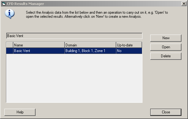 We are now ready to start a new CFD calculation so again click on the building in the navigator to move to the building level and click on the CFD tab. If you have just finished the first CFD exercise, the analysis results for these calculations will be displayed. You should now create a new analysis because the model has changed with the addition of the radiators. To do this click on the CFD Results Manager toolbar icon. This displays the dialog below.