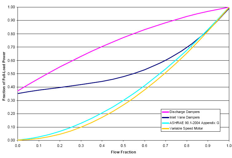The resulting power curves are shown in the graph below. The ASHRAE 90.1-2004 Appendix G coefficients are from TABLE G3.1.3.15, Method 2. The other sets of coefficients are from the EnergyPlus Input Output Reference, Fan Coefficient Values table.