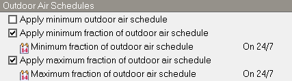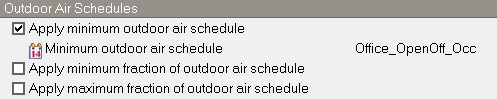 Note: If both the Minimum outdoor air schedule and the Minimum fraction of outdoor air schedule are both selected then for each timestep of the simulation, the higher of the two minimum limits is calculated and applied. Both of these settings act by overriding the Outdoor air flow rate.