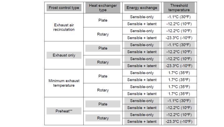 The appropriate threshold temperature varies with exhaust (inlet) air temperature and humidity, frost control type, heat exchanger type, and whether the heat exchanger transfers sensible energy alone or both sensible and latent energy (enthalpy). Typical threshold temperatures are provided in the table below. However, it is recommended that the user consult manufacturer’s information for the specific air-to-air heat exchanger being modelled.