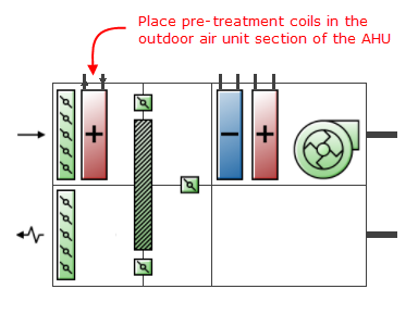 Pre-treatment heating and cooling coils, humidifiers and evaporative coolers can be included to ensure that the outside air is pre-conditioned before it enters the air handling unit. These coils are added in the same way as for other AHU coils, by navigating to the AHU object and placing coils in the outdoor air unit section of the AHU. This allows flexibility in the number and type of coils added and also in the way that they are controlled. See screenshot below.