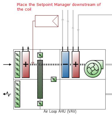 Separate SPMs are required for pre-heat and pre-cool coils to ensure the correct off-coil conditions even if there is a temperature Setpoint Manager placed on the supply air side of the AHU.