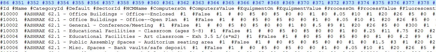 5. Study the format - there is no documentation to explain the format, but it is usually fairly easy to work out by reference to the corresponding DesignBuilder dialogs and the headers. Each .cdt file consists of a line of category ids, followed by a header line which indicates the meaning of the fields below. Each further line is a record with fields separated using the "#" character. See below for an example of ActivityTempates.cdt.