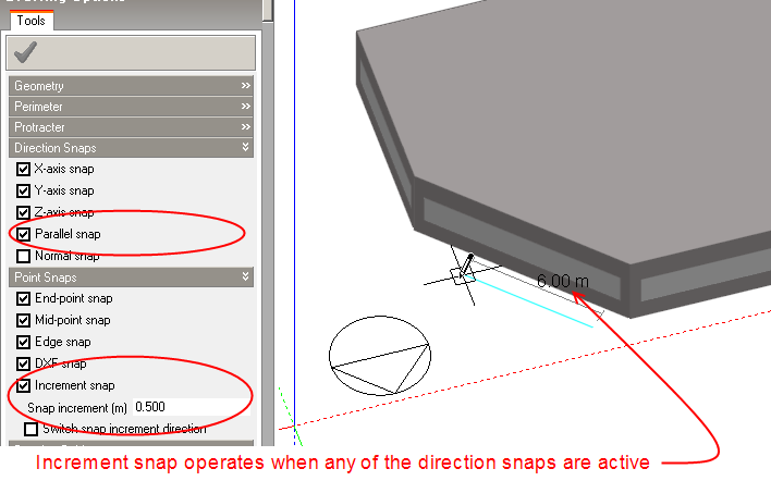 Note: the increment snap will only come into operation when you are drawing a line or moving a surface along a defined vector. For example if you are drawing a block perimeter parallel with an existing block edge, the increment snap will operate when the parallel snap is active and in this case you would be able to move the mouse cursor along the parallel vector in increments of 0.5m: