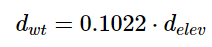 Williams and Williamson, 1989 provide this simple correlation to help estimate the depth of the water table, dwt from the site elevation above sea level, delev: